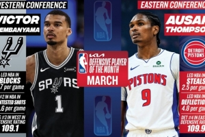 在3月份,文班亚马场均3.7次盖帽排联盟第一,场均11.6次干扰投篮排名联盟第二,马刺以109.1的防守效率排名西部第三;奥萨尔·汤普森场均2.5个抢断、4.8次干扰传球领衔联盟,活塞以109.9的防守效率排名东部第四。