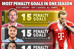 本世纪单赛季点球进球榜:凯恩41场15球居首,C罗、梅西14球次之