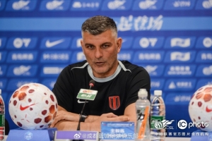4月24日下午,成都蓉城队主教练约翰・阿洛伊西与队员索罗金出席赛前新闻发布会。