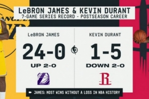 当2-0领先时,詹姆斯季后赛生涯系列赛战绩24胜0负。