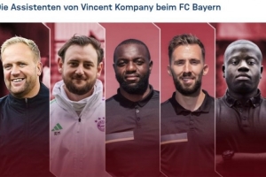 据德天空的报道,拜仁助教丹克斯(左一)将代替孔帕尼在场边指挥本场比赛,另外两名助教雷内·马里奇(左二)以及弗洛里伯特·恩加卢拉(图中)为其进行支持协助。