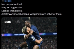 摩根写道:“这根本不是真正的足球。踢得太激进,防线漏得像筛子一样。阿尔特塔那支追求阵地消耗的阿森纳,足以磨死他们中的任何一个。”