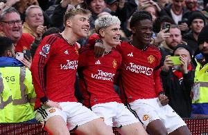 拉特克利夫爵士曾对一张照片赞叹不已:当时19岁的加纳乔、21岁的霍伊伦德和18岁的梅努坐在广告牌上,庆祝2024年2月曼联战胜西汉姆联时加纳乔的进球。